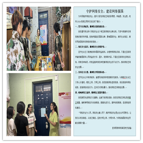 活动期间,四支部党员们一是以“网络安全为人民,网络安全靠人民”为主题,设计并张贴网络安全海报及网络安全倡议书于各寝室的思政平台宣传板上,让每位新生在寝室了解网络安全的重要性,掌握网络安全的防范要领;二是党员们前往男女生寝室进行网络安全宣讲,以实际案例引导同学们养成“文明上网、健康上网、绿色上网”的好习惯;三是倡议学院全体新生:网络安全无小事,共筑防线靠大家,呼吁同学们在运用网络时要坚守法律底线,强化安全意识,崇尚社会公德,争做新时代网络法制的建设者、网络安全的维护者、网络文明的推动者、网络正能量的传播者。