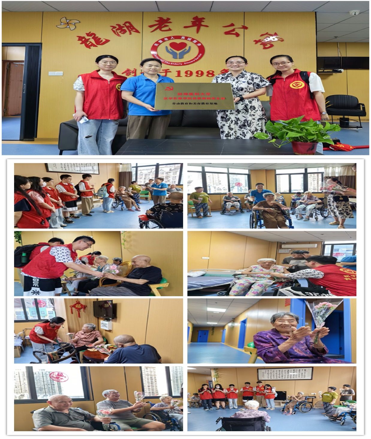 在龙湖老年养护院,袁院长介绍了养护院的基本情况,带领志愿者们参观了院内的休息室、多功能活动室、医务室、办公室、健康咨询室、餐厅等场所;现场志愿者们为养护院的老人们送上慰问品,献上鲜花,合唱《我的祖国》,歌唱过程中,老人们与志愿者们一起打起了轻快的节拍,脸上洋溢着灿烂的笑容。最后,四支部与龙湖老年养护院举行了劳动教育与美育教育基地共建的挂牌仪式,达成了每两月开展一次劳动教育相关活动的共识。