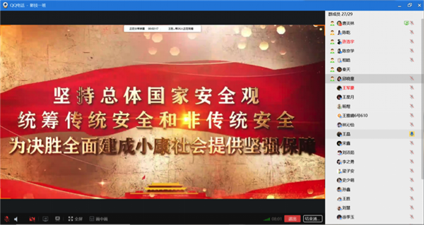 4月18日下午3点活动正式开始,各班主持人以群聊直播的方式开始了线上主题团日活动,同学们兴趣高涨,积极配合。主持人以屏幕共享的方式带领各班同学观看了中国工程院院士范维澄主持的“千万学生同上一堂国家安全教育课”,范维澄院士从国家安全定义、发展阶段、总体安全体系、维护公共卫生安全和生物安全和提升信息识别能力等方面进行了详细的讲解,同学们在听到自己感兴趣的内容时还会积极讨论,各抒己见。在观看完视频之后,主持人针对视频中出现的高频语句进行了解读,并就一些内容进行了提问。接着主持人进行了活动总结,并进行了人数统计,确保每位同学都参与了此次活动。