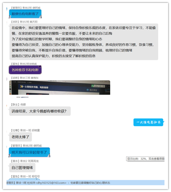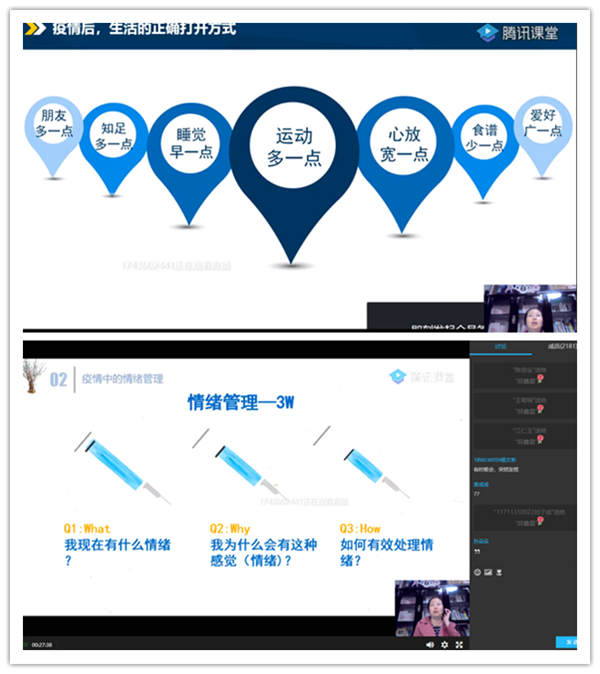讲座过程中及结束后,同学们也在老师的带领下展开积极的讨论,每位同学都发表了自己的感受和对情绪管理的看法。通过这次段鑫星教授的线上心理讲座,同学们学习到了很多情绪管理的知识和方法,相信同学们在此次线上讲座之后可以在生活中调整好自己情绪,此次活动对促进大学生心理健康水平、提升宅家抗疫生活质量具有重要意义。