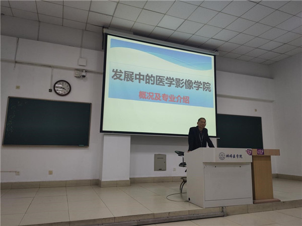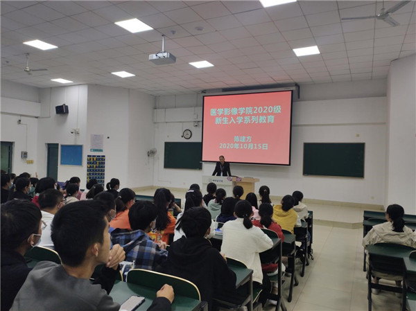 办学特色、人才培养目标详细地给新生们讲解了专业课程设置、专业培养目标和发展前景等问题。每一位同学都聆听得十分仔细,从他们好奇与认真的眼神中不难看出,他们对即将到来的大学生活充满了期待,亦对医学影像专业的学习充满了信心。面对青春蓬勃的青年学子,陈院长鼓励大家以积极的态度和饱满的热情投入到了丰富多彩的学习生活中去,珍惜韶华、奋发有为,成为祖国建设的有用之才、栋梁之材。