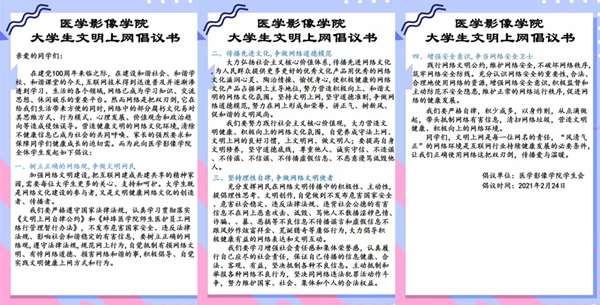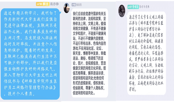 教育专题三:大学生文明上网倡议书与《蚌埠医学院师生医护员工网络行管理暂行办法》学习,倡议书与《办法》学习完之后同学们踊跃汇报了个人要树立良好网络观,争做文明网民,为自己也为他人营造一个健康、安全、绿色的网络环境。