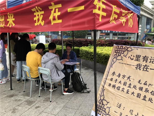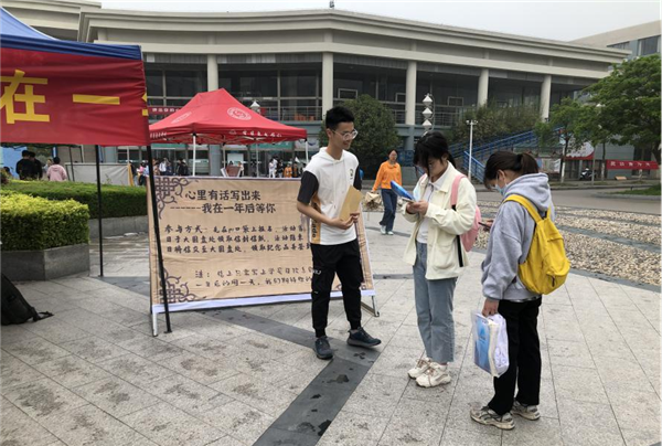 活动以“写一封信”创意形式,写下大学生参与者的心路历程,一年后,同一时间、同一地点我们还在这里等你回来,将信再交还于你。活动现场气氛活跃、反响热烈,很多大学生都怀着期待的心情参与活动,纷纷表示活动很有新意,希望一年后再收到这封信是会带着惊喜激动的心情,再看一年前写的内容时会有不一样的感慨。