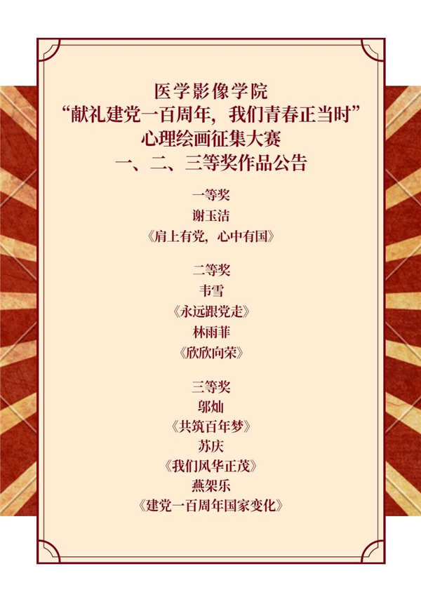 各年级学生踊跃参与。截止5月16日18点,共收到各类绘画作品120余件,影像学子用画笔展现以党史和心理为主题的设计构想,一幅幅作品创意十足、各有特色:有些作品围绕党史百年红色历程,回顾了中国共产党艰苦卓绝的创业历程和举世瞩目的伟大成就;有些作品讴歌爱国精神和时代精神,抒发出对中国共产党的热爱;有些作品围绕大学生的成长挫折和独特的精神画卷;有些作品展现了当代蚌医学子积极向上、奋力向前的青春风貌……
