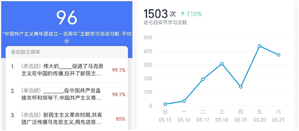 坚定不移跟党走,百年征程向未来。5月17日到5月21日,院团总支总结党史青年学习教育经验,进一步丰富思政学习资源,组织开展了“坚定不移跟党走,百年征程向未来”庆祝中国共青团成立一百周年主题网络平台学习活动。立足于学习通线上平台,院团总支主要围绕“习近平总书记在庆祝中国共产主义青年团成立一百周年大会的重要讲话”和“中国共青团一百年壮阔征程”两个主题,精心布置了“理论学习”、“主题讨论”、“学习心得”和“答题巩固”四个部分学习内容。活动一经发出,团员青年们积极响应,踊跃在学习通平台进行学习,深刻理解习近平总书记的谆谆教诲,领略中国共青团紧跟党为民族复兴不懈奋斗的伟大青春征程。活动开展期间,章节学习次数达1503次。