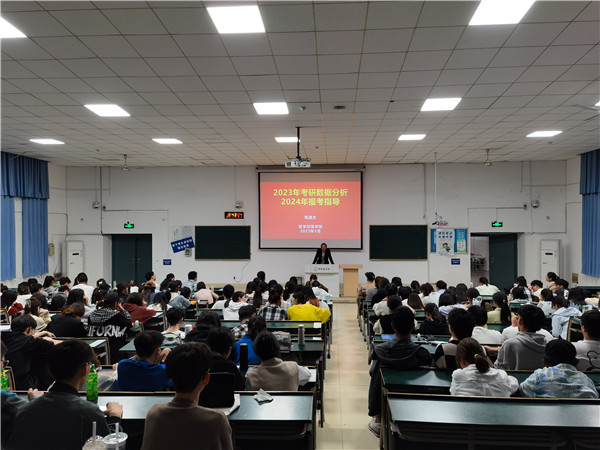 最后,陈建方以“2023年考研数据分析暨2024年报考指导”为题开展指导,从总体情况、录取分数分布情况、地域录取情况、省内外院校录取情况等方面详细介绍了我院2023年学生考研情况,并向今年备考的学生介绍了国内招收院校的分布情况,分析了各院校的报考难度、地域优势、学科实力,提醒学生注意地域、推免生、考试科目等报考影响因素,要求学生正确处理考研和实习的关系。