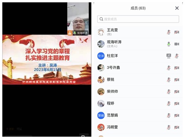 党委在理论楼108教室以线上线下相结合的方式开展专题党课,学院党委副书记吴涛以“深入学习党的章程,扎实推进主题教育”为题,给全院学生党员和思政委员上了一堂生动的党课,党支部书记乔兴、王兆雯分别以线下、线上形式参会,负责党课的组织。
