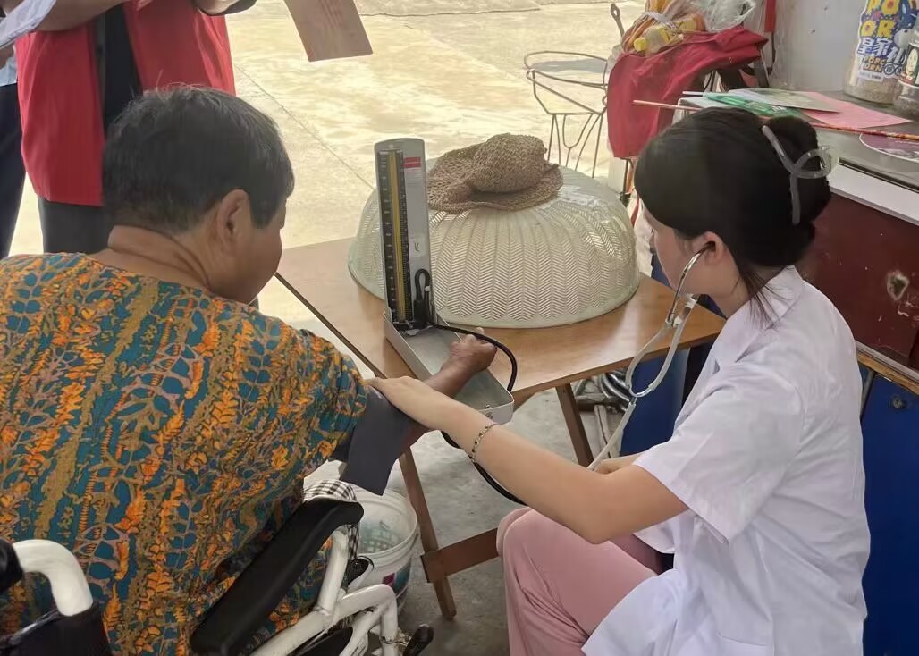 经过前期的社会调研,近几年脑卒中、冠心病等老年病的发生率逐年上升,而老年人们由于缺乏定期体检的意识和对病情状况的认识,往往不能及时就医而错过最佳治疗时间,是一个重大的社会隐患。了解到梅桥镇各个村有大量的留守老人,“医恋乡土青年筑梦团”与当地负责人提前联系安排,在7月11日早晨策划准备了有针对性的义诊活动。团队成员们按时来到规划好的义诊区域,按提前分配好的任务摆放好血糖仪、血压仪等基础仪器,在灼灼烈日下开展了为期一上午的义诊活动。在检查过程中,团队成员认真细心地为每一位前来的老人测量各项身体指标,并在检查结束后耐心反馈健康检查结果。除此之外,成员们还帮助老人们解答日常生活中可能遇见的各类医疗保健问题和健康问题,提醒他们饮食、生活等方面的注意事项,引导老人们遵循健康的生活方式和生活习惯。