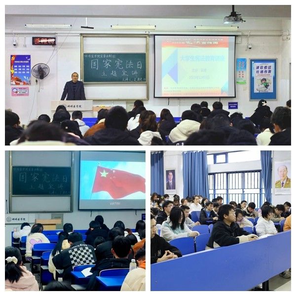 党委副书记、大学生法制教育工作室、大学生就业创业法律指导工作室负责人吴涛主讲。他介绍了《方案》的有关内容和要求,从多个维度阐释了学习宪法的价值和意义,对宪法的内涵以及我国宪法的发展历程、基本理论、基本原则、具体条文进行了讲解,要求广大学生积极通过文献、网络、实践等多种途径深入学习宣传贯彻习近平法治思想和习近平文化思想,认真学习宣传贯彻习近平总书记关于宪法的重要讲话和重要指示批示精神,努力提升法治素养,做堪当重任的新时代大学生。