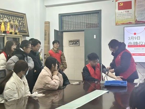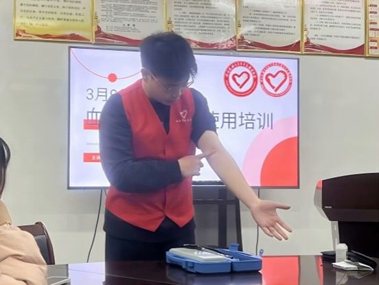 青年志愿者协会培训部成员为学院青年志愿者进行血糖仪、血压计操作培训。