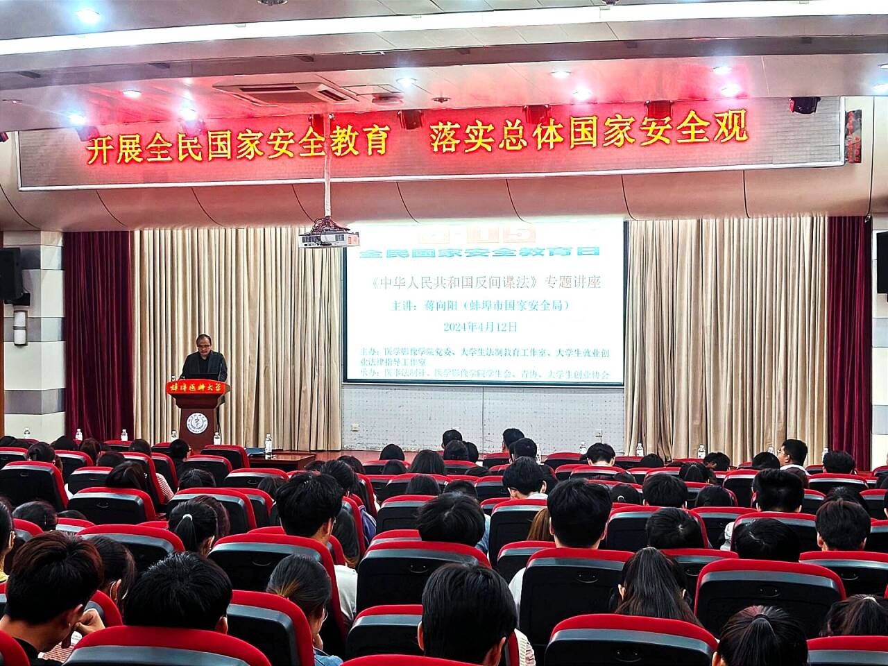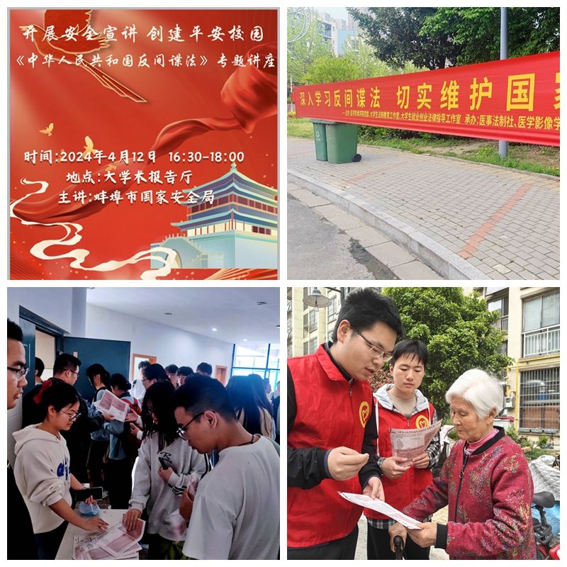 活动前期通过展板、条幅、海报、宣传单等在校内和周边社区进行广泛宣传,积极营造活动氛围。4月12日下午,邀请蚌埠市国家安全局领导来校开展《中华人民共和国反间谍法》专题讲座,学校保卫处处长荣梅生、成人电影