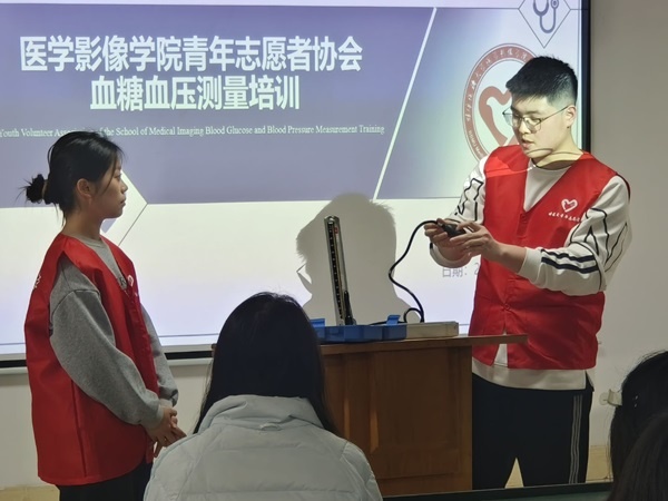 青年志愿者协会成员开展血糖仪与血压计使用技能培训。