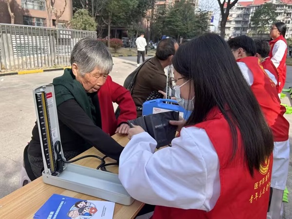 图一 志愿者们为社区老人测量血压