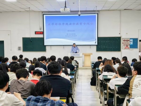 特邀陈兴武警长开展安全教育专题会,2024年级医学影像学、医学影像技术和智能医学专业全体学生及辅导员参会学习。