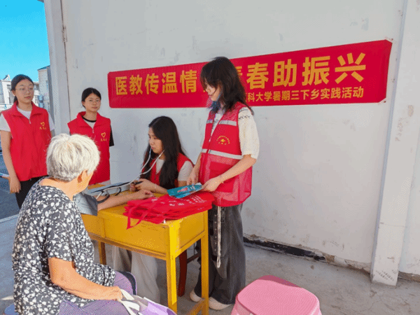 队员们与当地乡村卫生所联合搭建体检点,开展健康志愿服务,医生诊疗的同时,志愿者们为村民们免费检测血压,提供健康咨询和科普宣讲,围绕高血压、糖尿病等常见慢性病,流感、结核病等传染病,用通俗的方言和生动的漫画制作成科普手册,让村民看得懂、能运用,提升健康意识与自我防护能力,筑牢乡村健康“防护网”,助力村民科学管理健康。