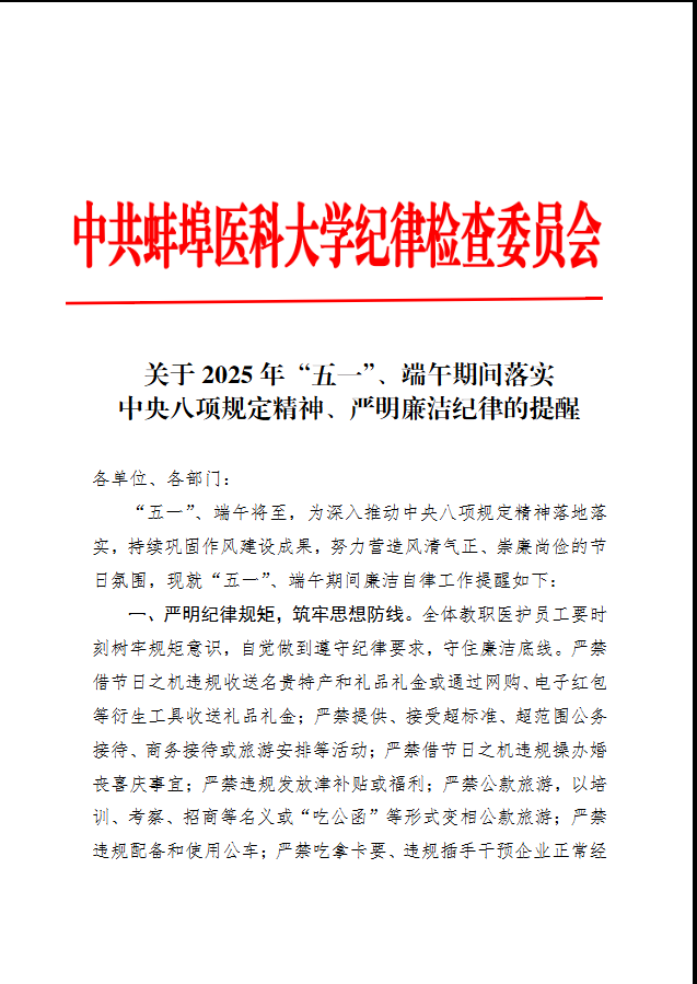 关于2025年“五一”、端午期间落实中央八项规定精神、严明廉洁纪律的提醒