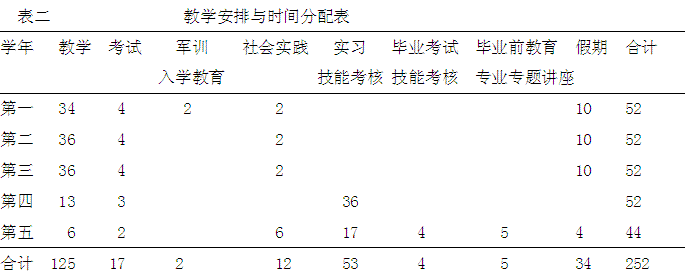 学制五年,共252周,其中军训、入学教育2周;教学125周;复习考试17周;社会实践12周;实践教学53周(实习);毕业考试毕业技能考核4周;假期34周。教学安排及时间分配见表二。
